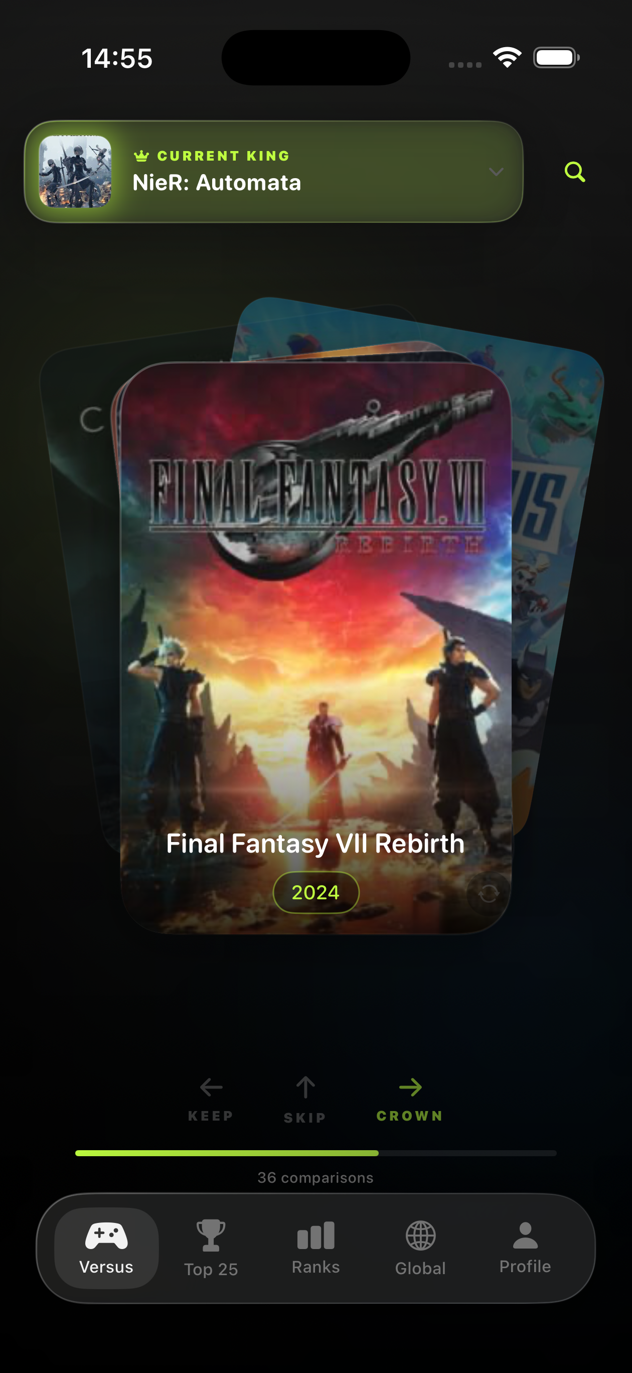 Forget star ratings and endless reviews. Versus cuts through the noise with a simple question: which game do you prefer? Pick between two games, and watch your personal Top 25 take shape. Each decision reshapes the rankings until your definitive list emerges. Fast, tactile, and surprisingly addictive.